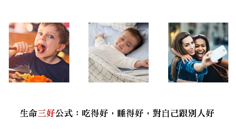 快速地跟聽眾們分享,作者在跟這些大師交流到最後,總結了一個很不起眼,卻非常有力,原來又非常簡單的事實,生命的基本公式,吃得好,睡得好,對自己跟別人好,就這樣!