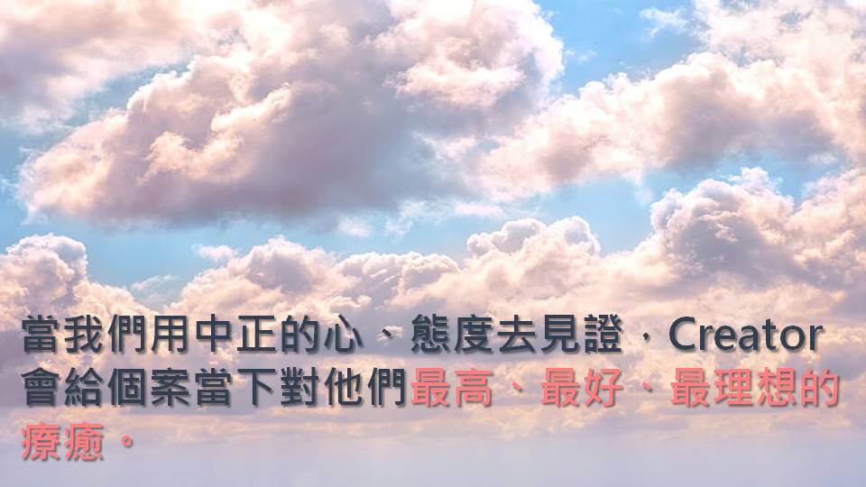 Creator是療癒師,我們只是見證著。也就是說,當我們用一個中正的心、中正的態度去見證的時候,Creator就會給那些體驗者、個案,給他們當下對他們最高、最好、最理想的療癒。