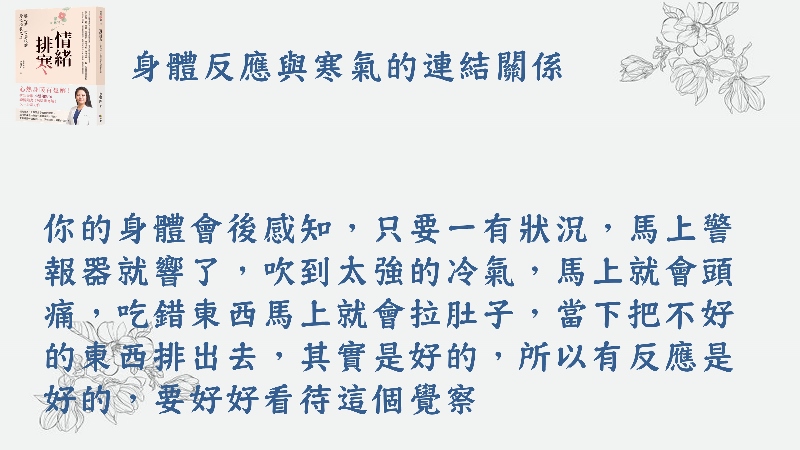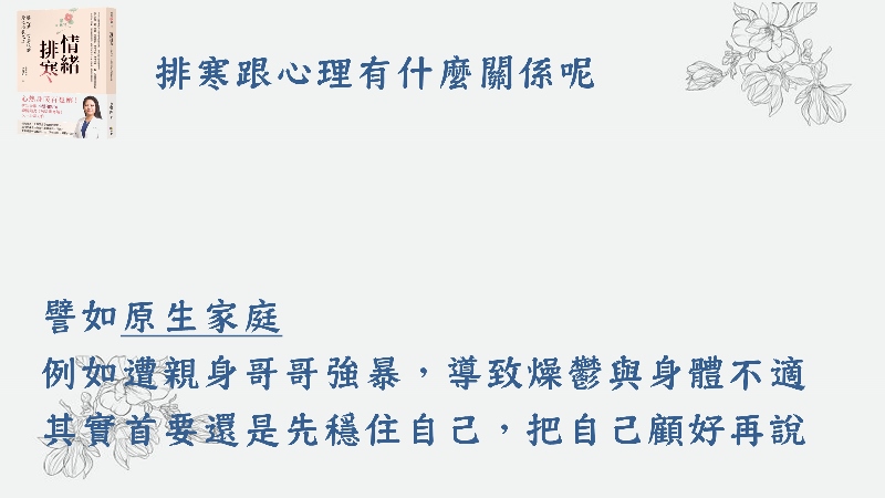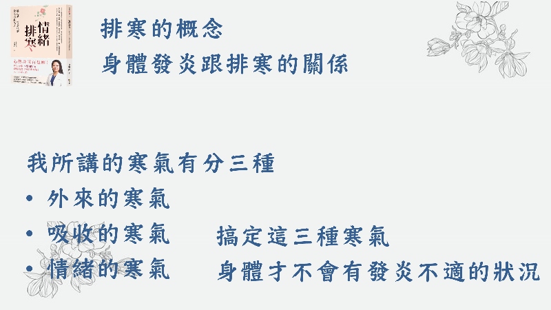 叫做情緒排寒,副標題是解心結、拔病根的身心溫養之道,是李璧如醫師所寫的非常棒的一本書,線上是李醫師,先跟聽眾打個招呼吧!