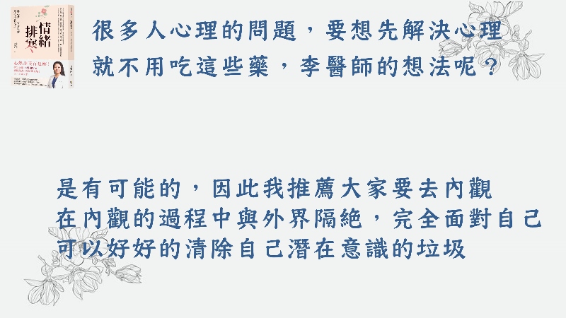 3.很多人得心理的問題,要先解決心理,就不用吃這些藥,李醫師的想法呢?