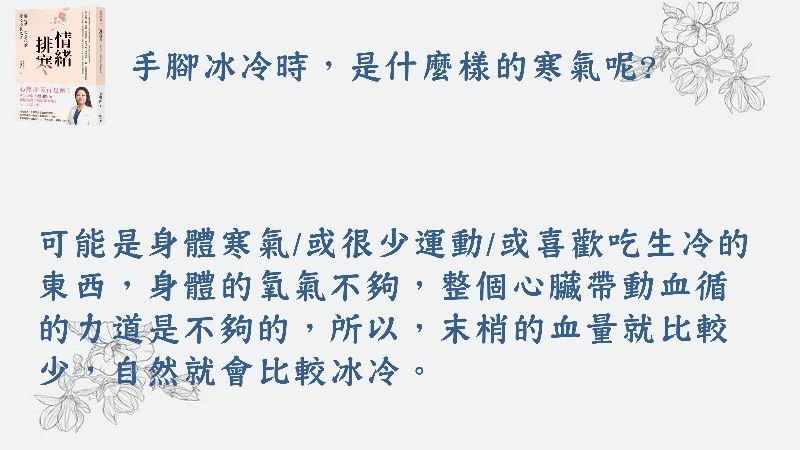 可能是身體的寒氣,可能平常很少運動,又喜歡吃生冷的東西,身體的氧氣不夠,整個心臟帶動血循的力道是不夠的,所以,末梢的血量就比較少,自然就會比較冰冷。