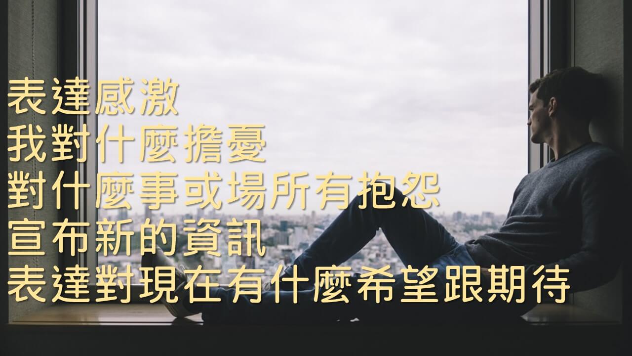 表達感激、我對什麼擔憂、對什麼事情或場所有抱怨、宣布新的資訊、表達對現在有什麼樣希望跟期待