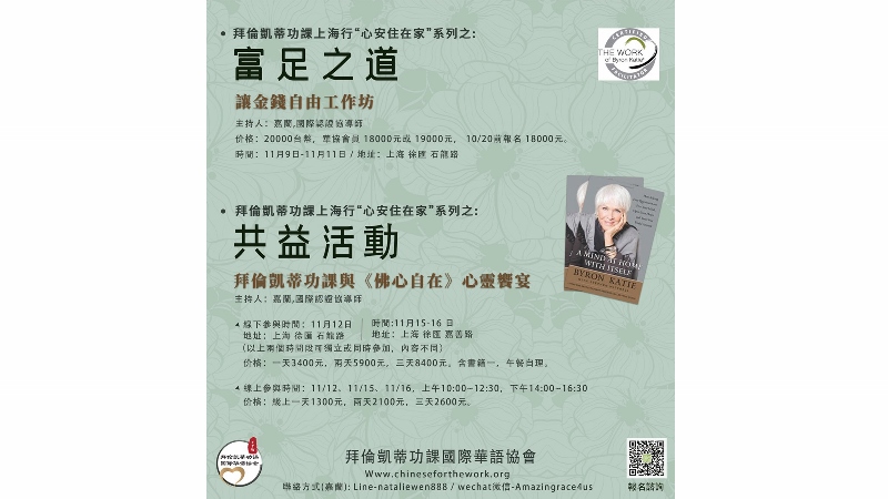 富足之道--讓金錢自由,拜倫凱蒂“功課”工作坊(含“心安住在家”共益活動介紹) | 11.9-11 上海https://mp.weixin.qq.com/s/NUtb5ki5yxu3eROOvWN-uA?fbclid=IwAR3FRGk4pTJGMzyS4BQNL6VcgMQGlj-fbpWmcmCZN2etO0XGT1GfJoeL_T4