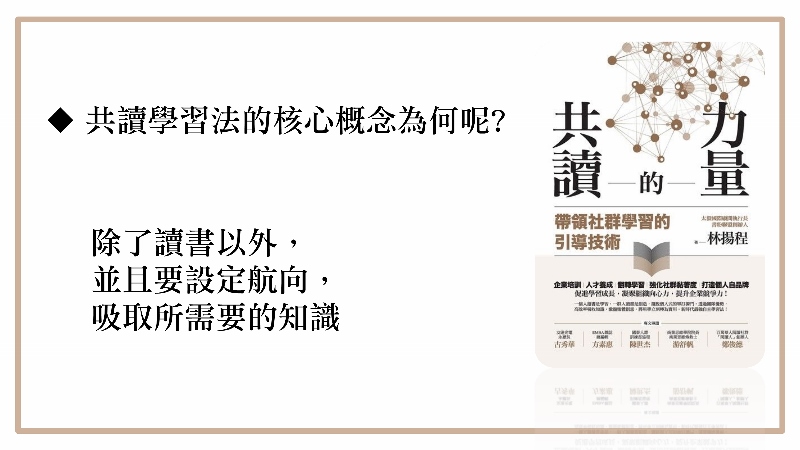 提倡一種方式,讀書會的過程中,讓大家能夠探討一些跟工作和生活相關的議題,去想怎麼把書的知識使用。