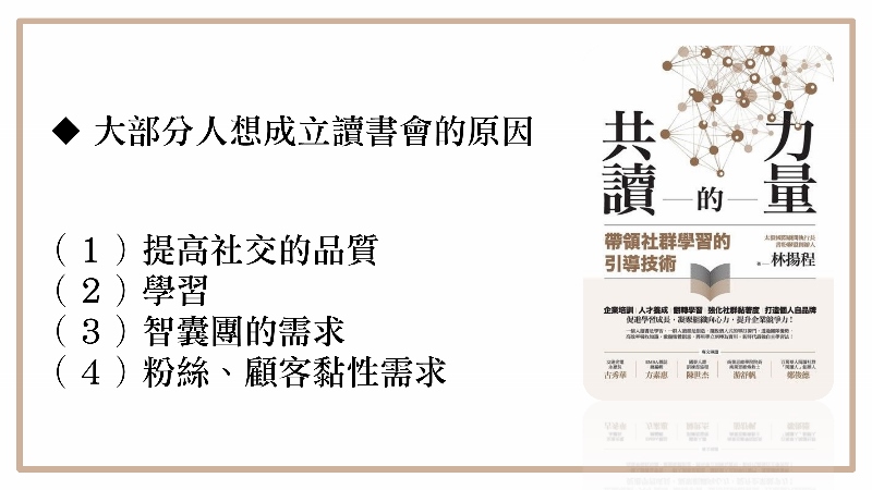 因為我成立書粉聯盟,兩年已經有將近80個讀書會,在60-70個讀書會的時候,我們做了一個統計,是什麼人會想要成立讀書會,有四種原因。