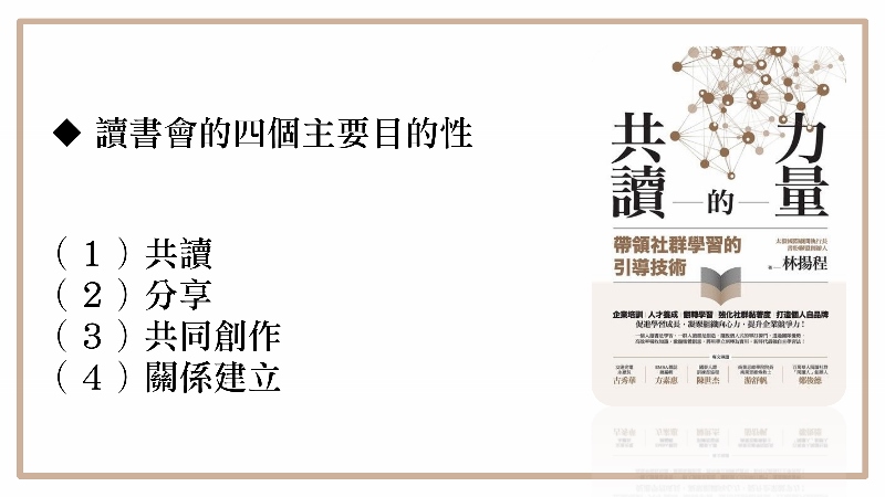 剛提到的RSCN,共讀、分享、共同創作到關係建立,四個主要在讀書會的目的。