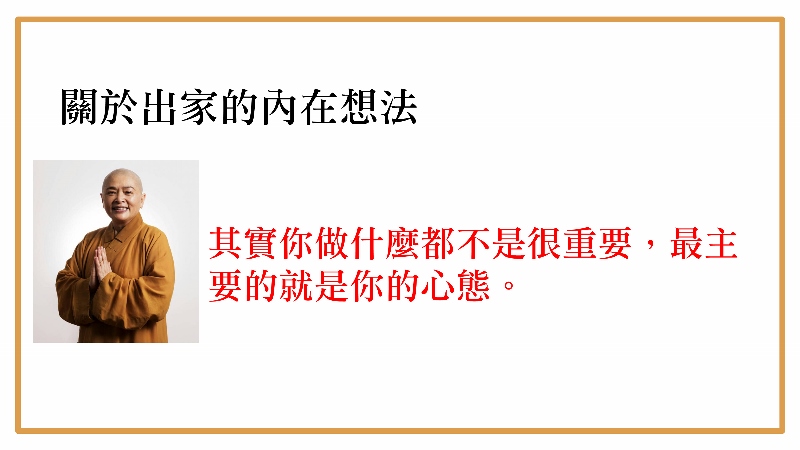 當然我的家裡面的堅持,必須要回去把這個學問,就是說大學的學位完成,我覺得那時候所接觸到的人間佛教,也不違背,那時候,星雲大師也是提倡,以出世的精神,做入世的事業,我覺得其實你做什麼都不是很重要,最主要的就是你的心態。