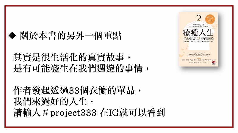 其實是很生活化的真實故事,是有可能發生在我們週邊的事情,也是作者發起透過33個衣櫥的單品,我們來過好的人生,請輸入#project333 在IG就可以看到