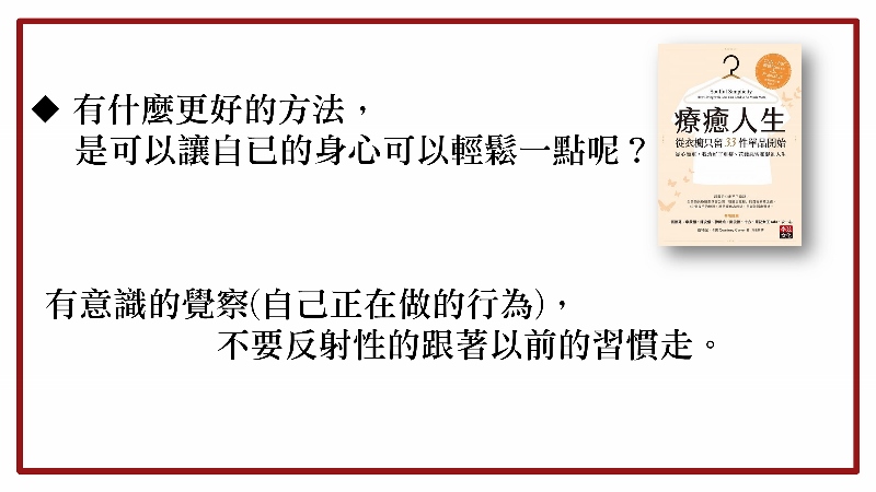 因此她就決定很誠懇的面對她自已以前的問題,導致她生大病,導致她有花錢的惡習,負了債,然後很雜亂,很忙亂的這個歷程,她都有寫,因為她曾經有失敗的婚姻,是單親媽媽,後來又再婚,而且她生了重病,她到現在有九年的時間都在對抗多發性的硬化症,才三十歲就得了這個病。對她來講真的是一記當頭捧喝,她就開始去反省她自已的人生。這本書,說起來其實蠻簡單好讀的,因為她的故事講的很誠懇,然後她寫的文筆也很流暢。我自已讀的感覺是等於是在慢慢地在跟她交心的去看這個部分。