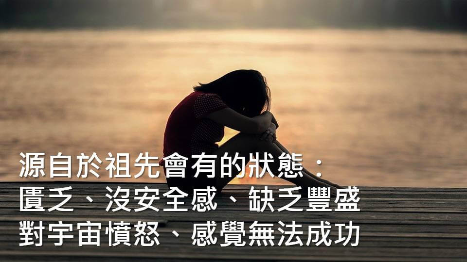 所以匱乏、沒有安全感、缺乏豐盛、對宇宙有憤怒、感覺到沒有辦法成功,這些其實源自於祖先。