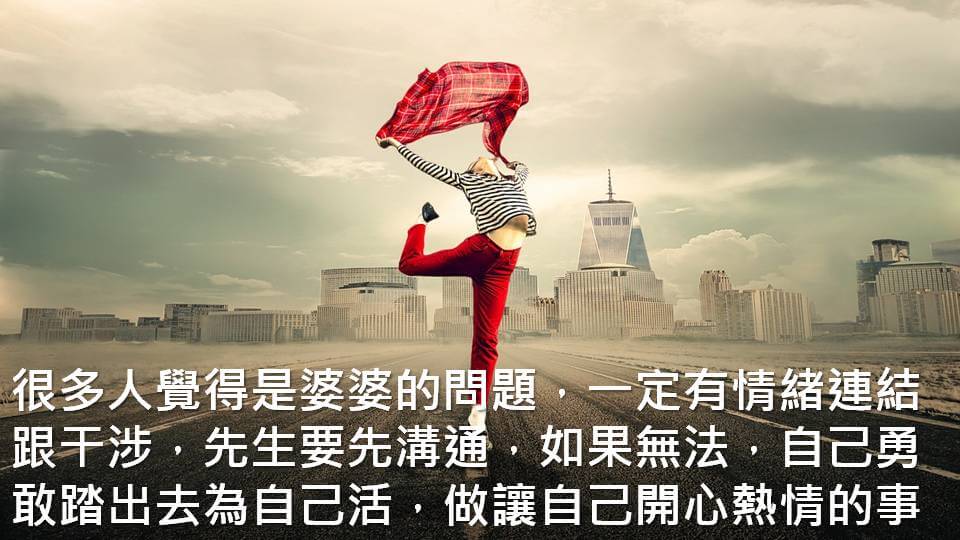 很多人會覺得是婆婆的問題,當然一定有情緒的連結跟干涉,先生這個部分要先溝通,疏通協調,如果沒有辦法,自己勇敢的踏出去,可以再為自己活這一塊,做一些真正讓自己開心,有熱情的事。