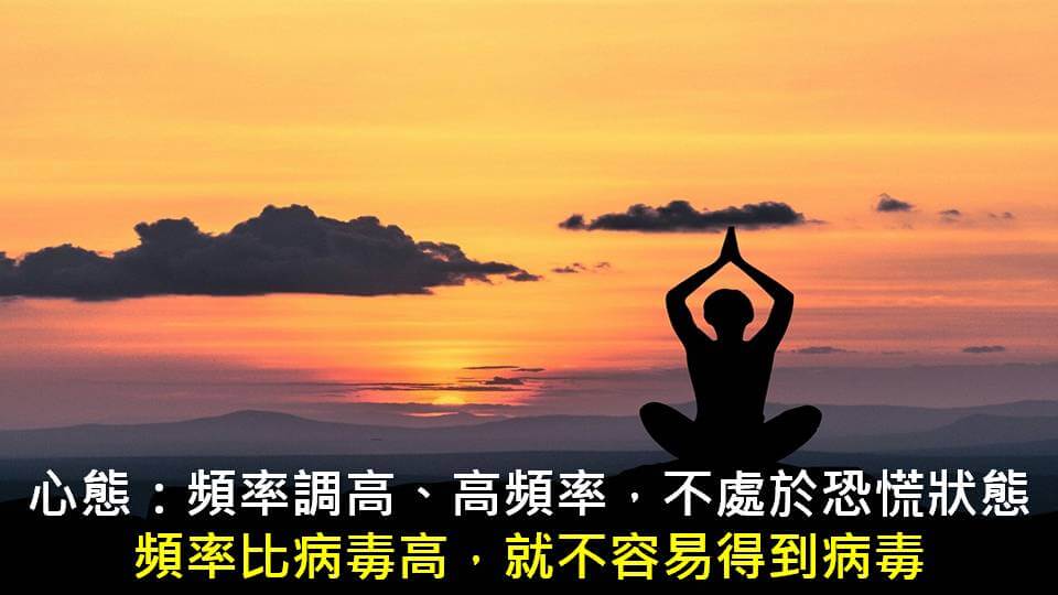 讓你的振動頻率提高,病毒的振動頻率沒那麼高,他跟你的頻率不搭,就沒有辦法跟你對到頻率,所以當你心智、身心靈很強壯,你的想法都是很正面、正向時也會反應到你的免疫系統,系統也會變得更強壯,才有辦法對抗外面所有一切的病菌。