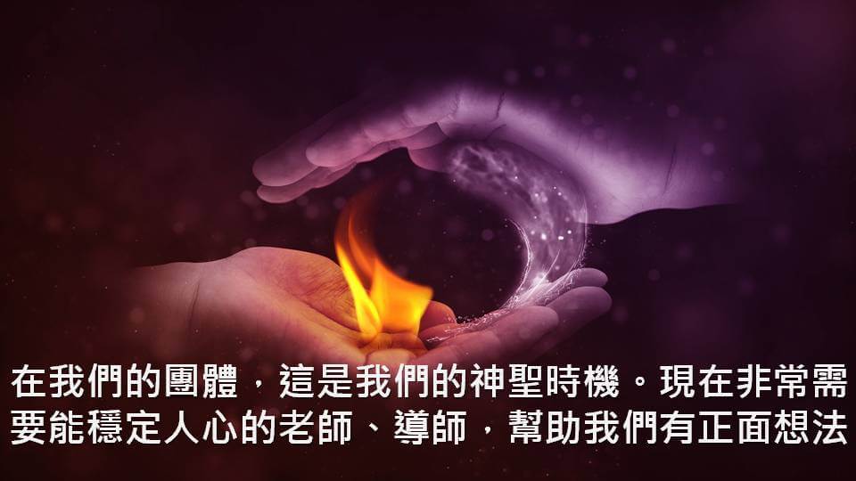 在我們的團體來說,這是我們的神聖時機。我們現在非常非常需要能夠穩定人心的老師、導師,能夠幫助我們可以有正面的想法。