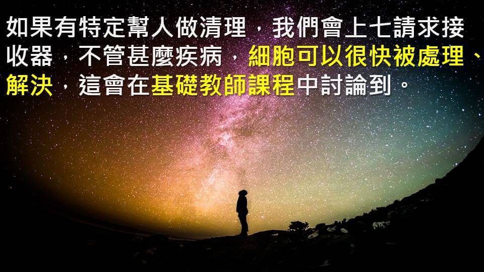 從我們的角度要把這變成一個很大的轉機,透過連接造物主的能量,我們可以去幫助人們,我們一直有送無條件的愛給受影響的人,身處於那個很大恐懼的區域當中,我知道他們有很大的困境,但是要讓他們感受到造物主的愛。如果我們有特定幫人做清理,我們會上到第七界請求接收器,不管甚麼疾病,細胞可以很快被處理、解決,根據個人的信念系統,將決定多快治癒這些資訊,這會在基礎教師課程中討論到。