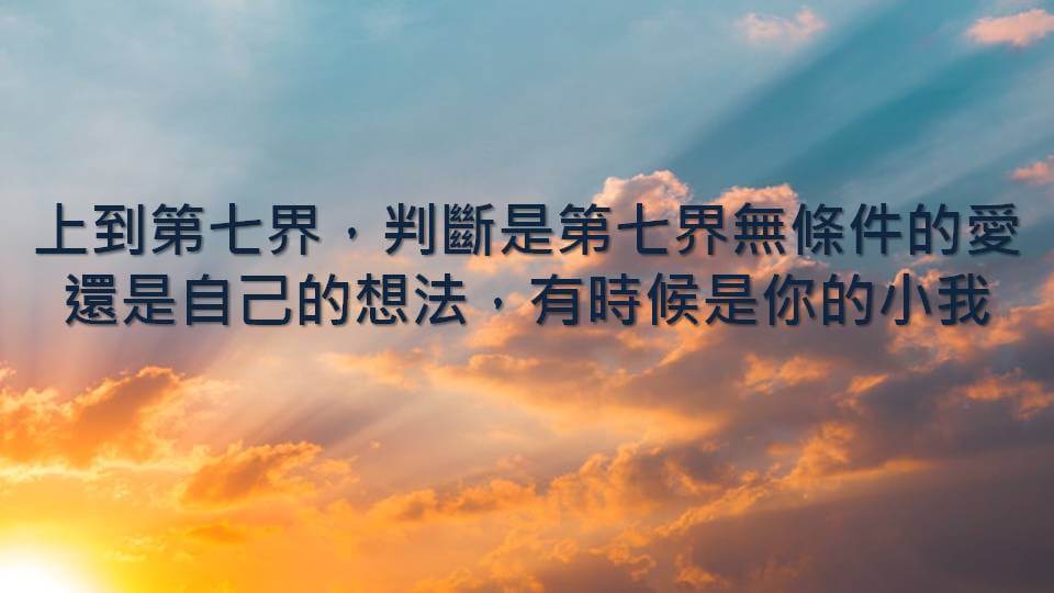J:最重要是上到第七界能夠有判斷力去分辨第七界無條件的愛,還有自己的想法,有時候是你的小我。當你進入到創造的能量時,有感受到改變,也知道透過一小部分一切萬有的能量,你可以創造一切!