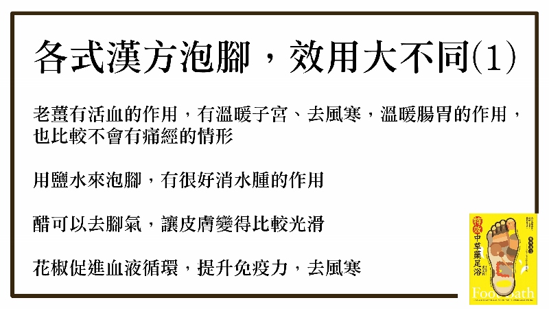 比如說,第一個我們常常用老薑片或是生薑片,大概用50克到100克然後把它切成一片一片以後,先放在鍋子裡面煮一下,煮開了以後,大概維持5分鐘到10分鐘,把它倒在泡腳桶裡面。