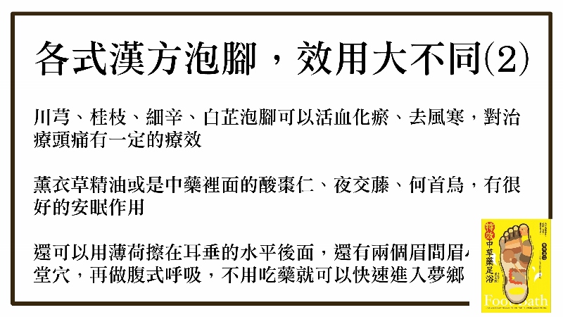 大家要記得剛剛有提到,不管是史丹佛大學還有日本的睡眠中心提到,針對這些失眠的病人,我們在泡腳的時候,除了剛剛講的這些藥物加進去以外,還有按摩三陰交、湧泉、太衝穴,在書上這些穴位的標示的蠻清楚的,聽眾朋友可以去看一下。