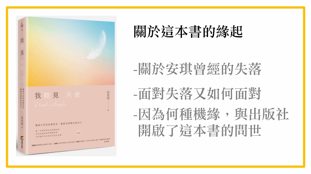 今天謝謝安琪,雖然短短跟我們講了這一些,我聽見天使裡面的一些重點,剩下就請各位還沒看的,趕緊去買這本書來看囉!