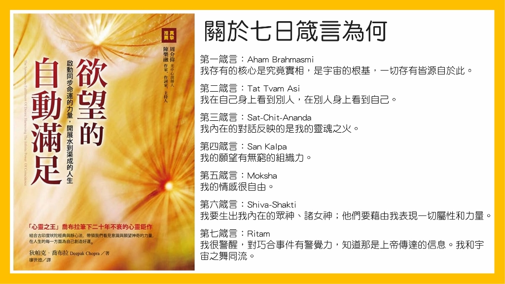 這本書,主要講的是兩部分,一個是教你同步命運、同步性的概念,另外一個實作方面,教你吠陀哲學的七個原則,實際的來練習,讓你更接近同步命運跟融入宇宙之流當中。