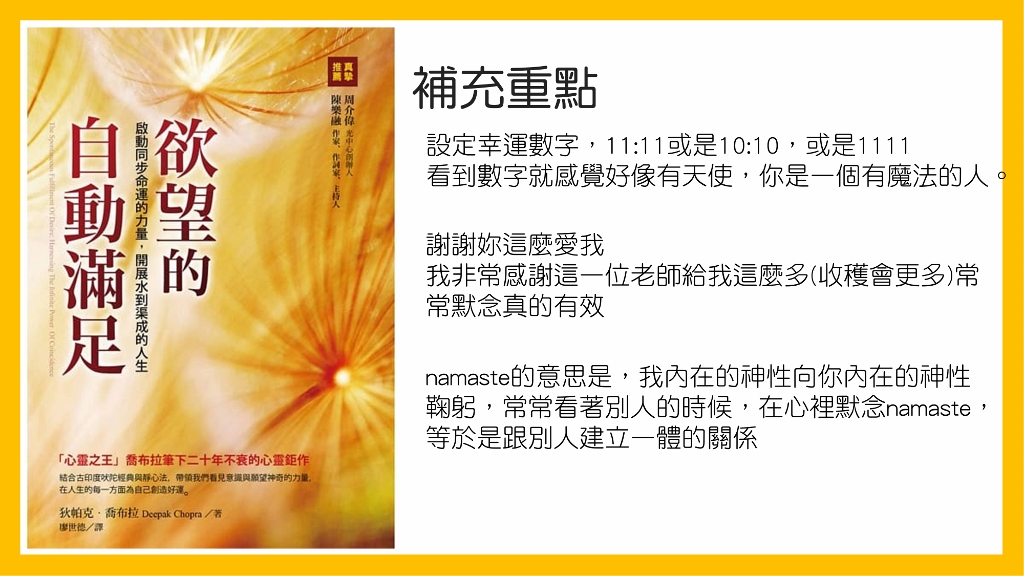 它跟坊間的心想事成、心靈法則,當然有一定的差距,就覺得蠻特別的,用另外一個角度來探討怎麼樣心想事成這件事情。