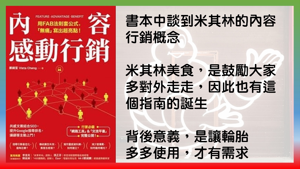 我來分享一下,內容行銷,英文叫做content marketing,內容行銷是這幾年在數位行銷領域算是很夯的一個話題,但其實內容行銷並不是一個非常新的東西,在國外行之有年,甚至米其林的美食評鑑,是一種內容行銷的展現,內容行銷不算是一個非常新的玩意,這幾年在國內外非常紅,相對來講在國內比較少有專門的網站、書籍在談內容行銷,大多還是在談傳統的網路行銷或是談臉書廣告投放,當然也是很重要。
