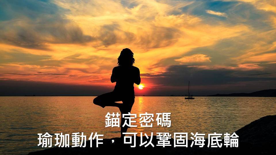 錨定密碼是能量七密碼的第一個密碼,也是最基本。以輪脈思考的話,身體最基本的是從下面海底輪......相信大家都常聽到海底輪不穩、人沒有能量、沒有最堅實的依靠,根基不實,就會從這個海底輪開始,教讀者如何把能量收束到最基礎,打好底,對應的瑜珈動作........是什麼樣的動作可以扎根,,就是海底輪的扎根。