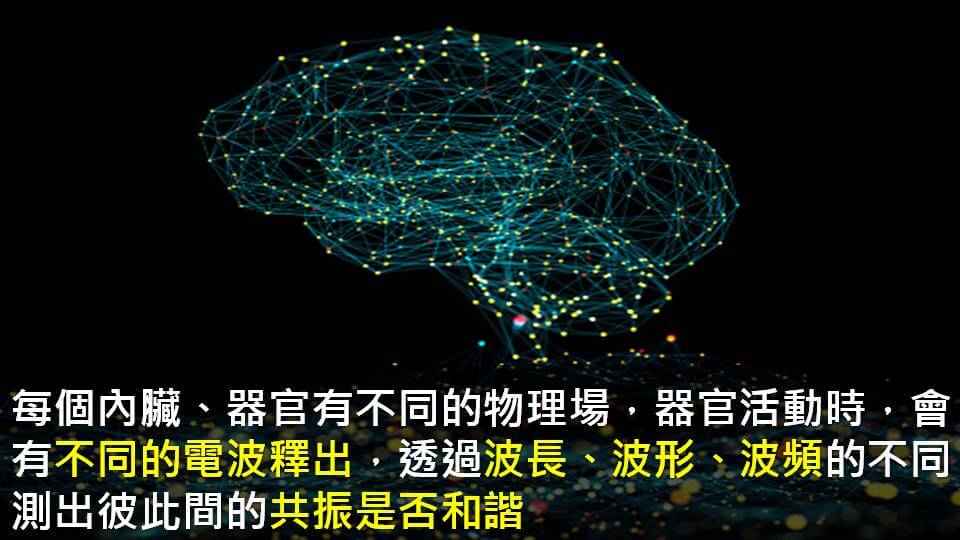 研究發現每個內臟、器官都有不同的物理場,當我們的器官在活動時,都有不同的電波釋出,透過波長、波形、波頻的不同可以測出彼此間的共振是否和諧。