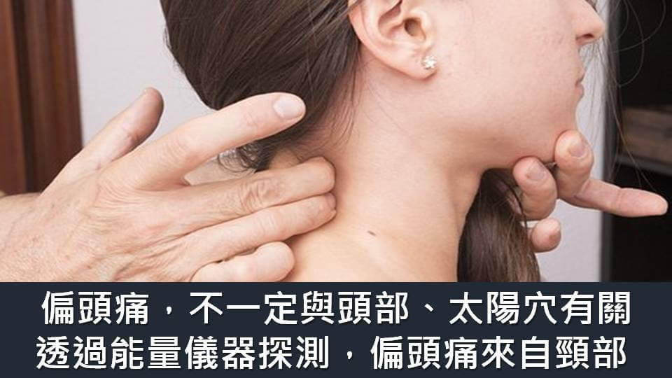 我很常偏頭痛,當時一直不知道原因是什麼,直覺認為可能是頭部、太陽穴的問題,可是當他們用能量儀器探測時,發現我的偏頭痛來自我的頸部。