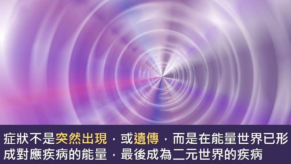 一般來說症狀的顯現並不是我們所認為的"突然出現",或是"單純遺傳",而是在能量場的世界中就已經形成對應疾病的能量,最後成為我們二元世界的疾病。