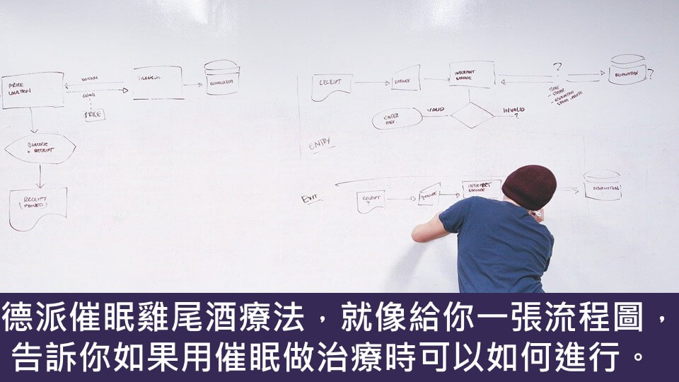 德派催眠雞尾酒療法最主要是涵蓋整體做催眠的流程,我們給你一張流程圖,告訴你,如果你要使用做催眠來治療時,原則上可以怎麼樣的進行。