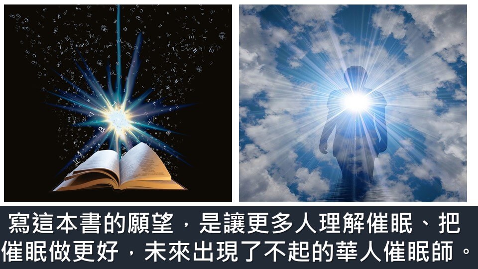 我寫這本書有一個願望,讓更多的人可以理解什麼是催眠,更多的人可以把催眠做的更好,然後有一天我們就可以有屬於華人自己的了不起的催眠師,想到催眠師就會想到,大德......我們有一個真正的華人自己的催眠師,他才是符合我們文化的一個催眠師,最終我們自己可以產生這樣的催眠,我起初最大的願望