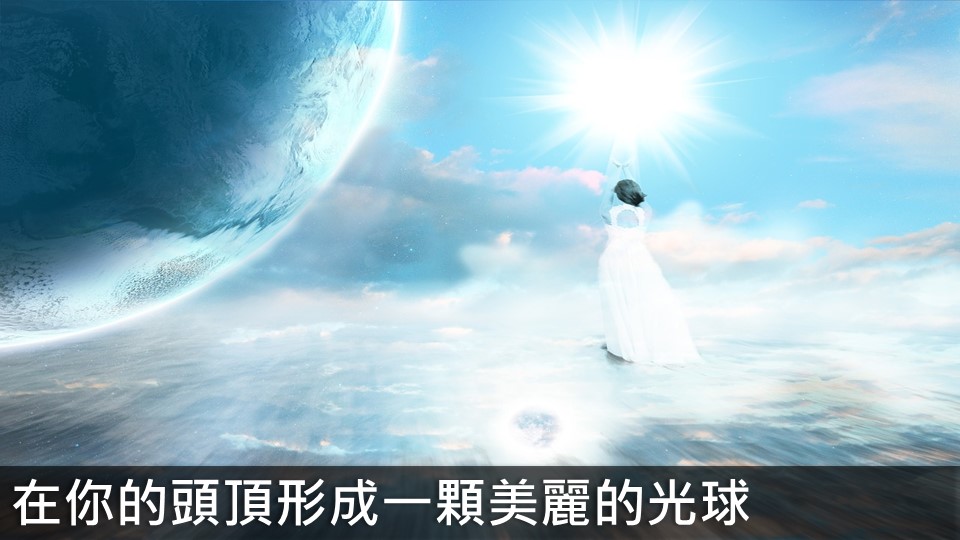 想像地球正中央出現一道很強烈的白光,想像這道白光穿越了你的全身來到你的頭頂,形成一顆美麗的光球,想像你自己在這顆光球裡面。