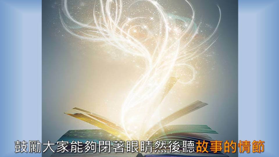 我們會蠻鼓勵大家就是能夠閉著眼睛,然後繼續聽那些故事的情節。然後去感受一下:欸~ 你自己腦海啊有沒有飄出一些什麼樣的故事? 就是形象 出來。