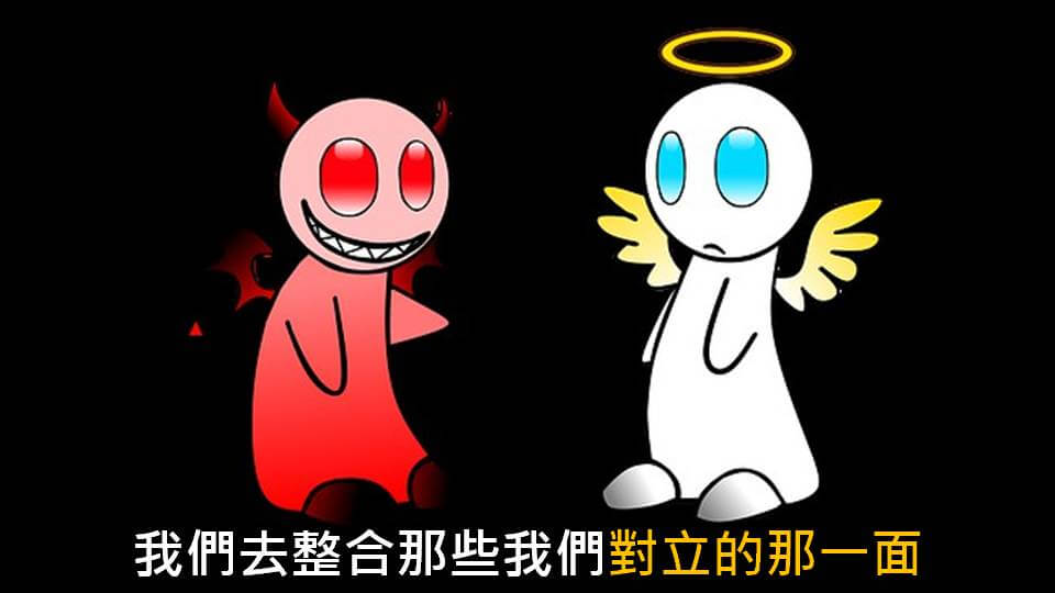然後也包含就是說,也許你本身很擅長用一種比較理性、或是良性的方法來對待這個事情。那個體化通常就是另一個機會讓你去學習那些跟你不一樣的面向的價值觀。