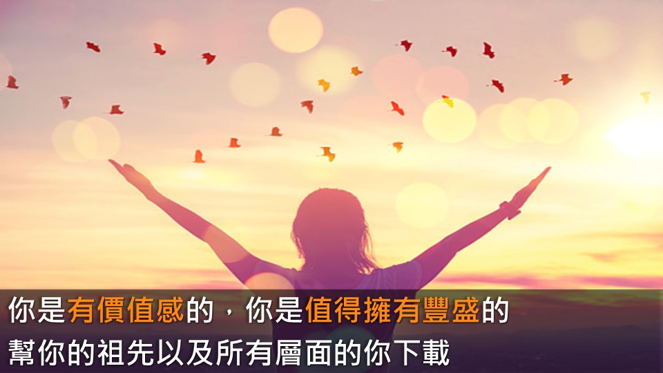 聽到第一個很大的聲音就是價值感,幫所有層面的你下載你是有價值感的,你是值得擁有豐盛的,幫你的祖先以及所有層面的你下載,你可以找到生命的禮物,你的靈魂特質,去開創無限的豐盛,同意的說Yes。