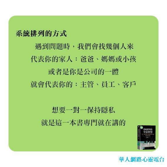 那麼我們就可以做叫做一對一 的方式走,然後就是這一本書專門就在講就是:欸~ 你不用在團體裡面把你的問題說出來,有一些私人的個案我們可以在一對一裡面做,一樣可以探索到你生存的一些跟系統有關的家族啊,或者你的公司啊,或你個人深層的心理的一些狀態。