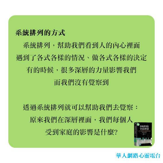 那有的時候呢,很多這些深層的,就是說整個系統的力量影響我們,我們沒有覺察到。那透過系統排列這個方法就可以幫助我們去覺察:原來我們在深層裡面,我們每個人受到家庭的影響是什麼? 甚至是上一代,甚至有的是要到曾祖父輩都有…可以去覺察到。