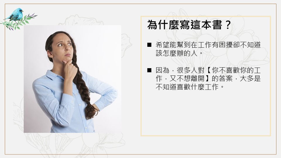 當我又再問他們【你為什麼不喜歡你的工作,又不想要離職呢?】,他們給我的答案,大多是他也不知道他喜歡什麼樣的工作。