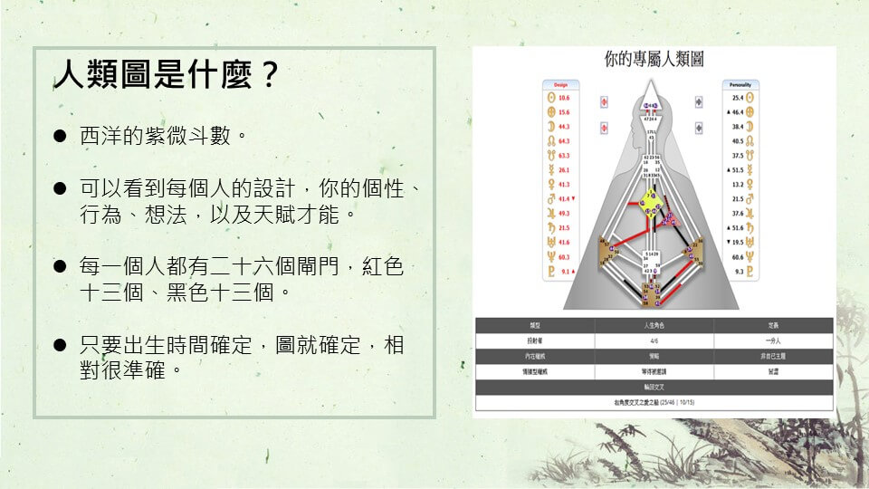 而人類圖的部分,只要你的出生日期時間確定,你的圖就確定,相對來講是很準確,而不像其他的那樣,模糊空間比較大。人類圖,相對是比較精準的,可以看到一個人的天賦才能。