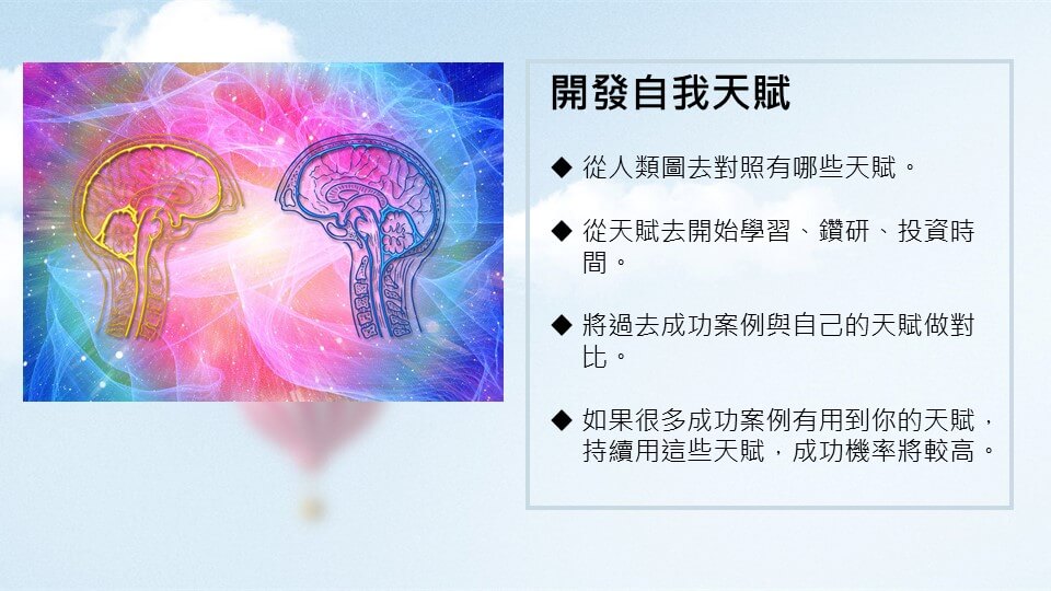 我們試著將過去成功的案例與自己的天賦才能做對比,如果發現,確實有很多成功的案例都會用到某些特殊的天賦才能,那只要在未來,持續用這些天賦才能,那我們的成功機率就會比較高。