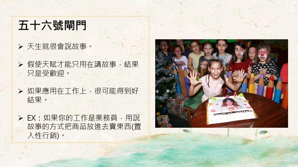 因為擁有五十六號閘門的人,他們天生就很會說故事。當他的朋友圈中,都非常喜歡聽他講的故事,他只是把天賦才能用在講故事,結果也只是受歡迎。