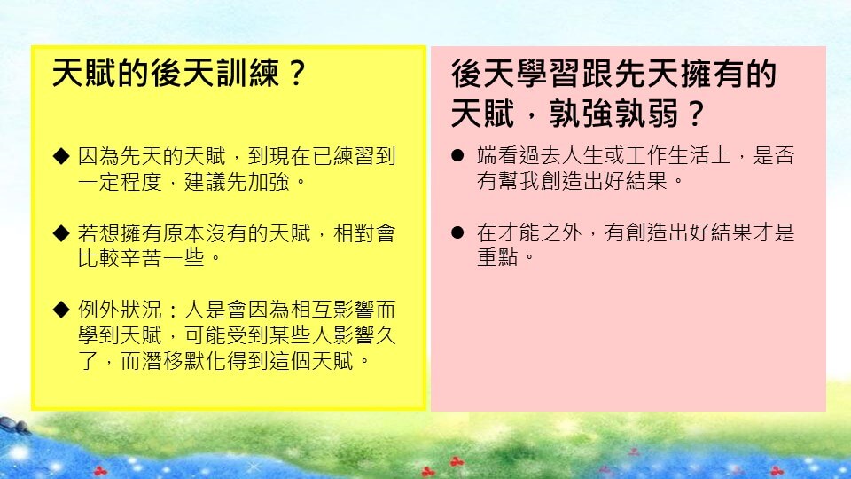 我比較建議,先加強已經有的,因為從小到大,就已經將已經有的天賦才能練習過很多次,已經是不錯的了。