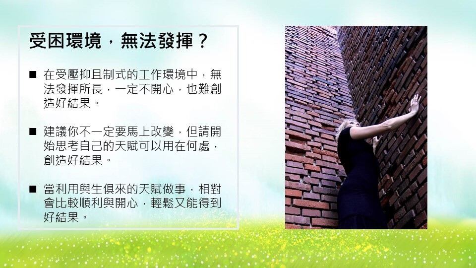 我常這樣舉例,各位在知道自己的天賦才能後,再回想過去的人生,可能很容易會發現,過去一些成功的案例都有用到某些天賦才能,而不會認為那時只是運氣好,所以成功了,假如當時失敗的話,是不是也只是認為運氣不好呢?