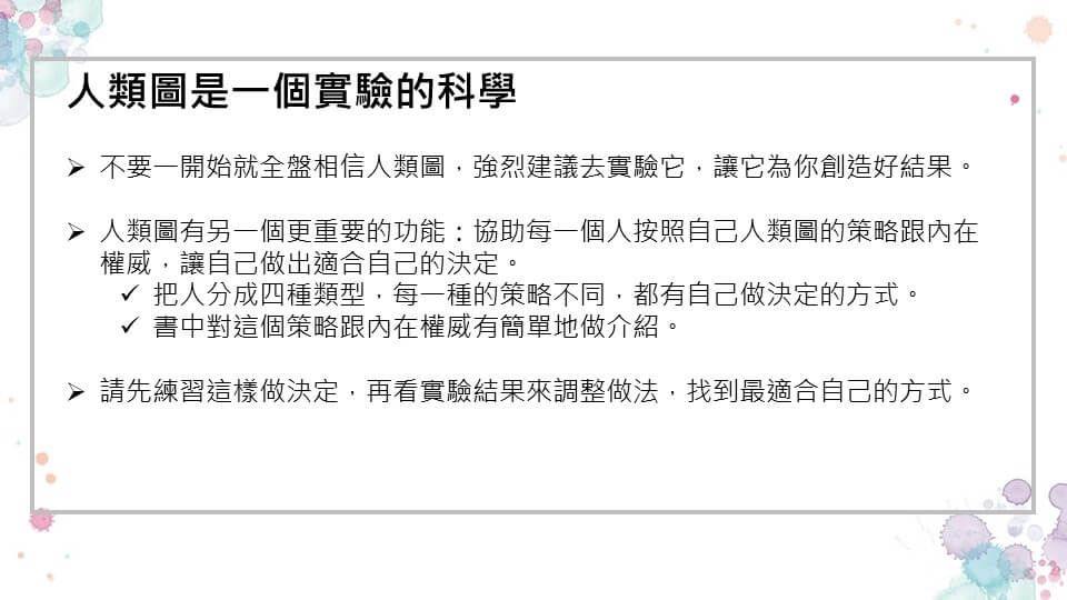 其實,人類圖除了這些以外,還有更重要的一個功能,就是能夠協助每一個人按照其人類圖的策略跟內在權威,讓自己做出適合自己的決定,而不是別人告訴你的,這點是我覺得它跟其他工具比較不同的地方。