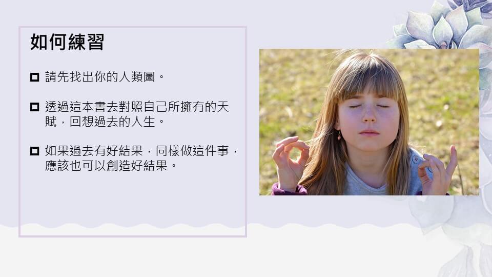 建議大家現在可以開始去練習。你可以先去找出你的人類圖,透過這本書去對照自己有的才能的部分,再去回想過去的人生,有沒有用這些才能去做出什麼好結果?