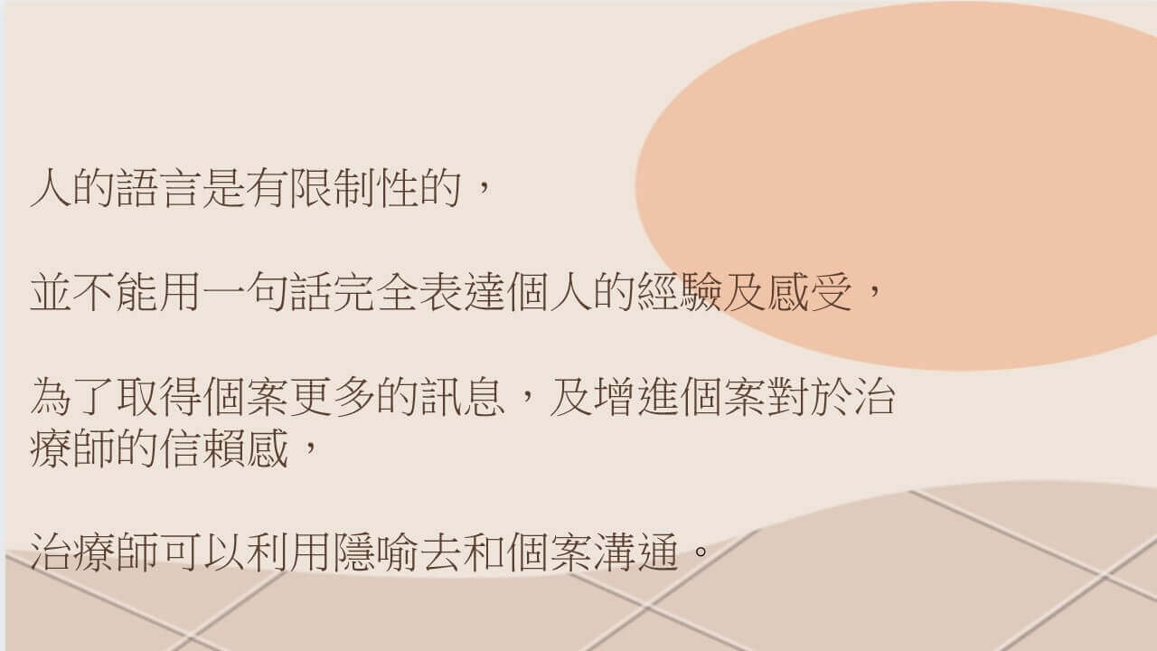 當治療師利用隠喻去和個案溝通,去增進個案對於治療師的信賴感,以便和個案有更深議題去做療癒。