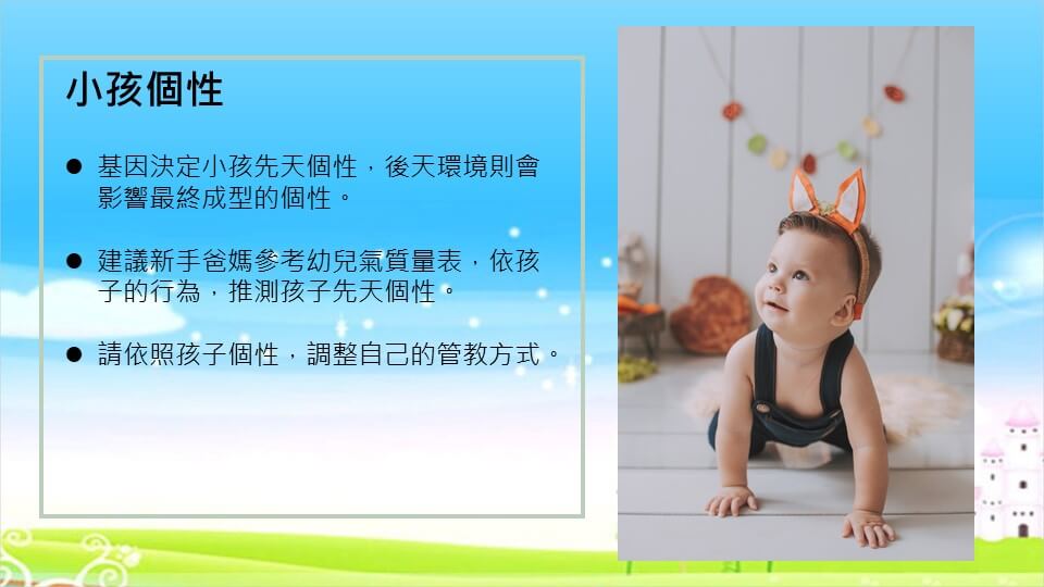 在管教方面,則還蠻建議新手爸媽們去參考幼兒氣質量表,依照孩子行為的特性決定管教的方式,可以讓新手爸媽們能更輕鬆地管教。