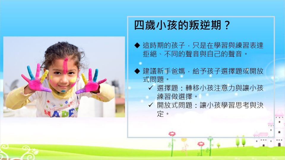 建議爸媽們或許可以給予孩子一些選擇題或是開放式問題,除了能避免爸媽與小孩的情緒衝突外,也同時能轉移孩子的注意力,並且讓孩子在溝通過程中學習思考與練習做決定。