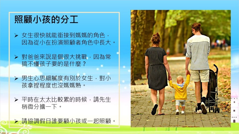 不過,還是請先生在平時太太比較累時,稍微分擔一下照顧小孩的責任吧。