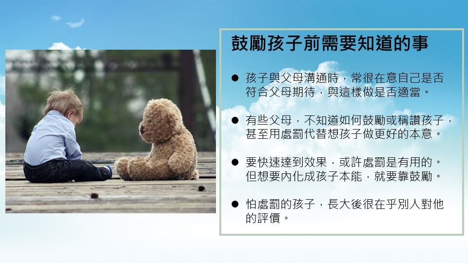 想要快速達到你們想要的效果,或許處罰是有用的,但如果想要內化成孩子本能,就要靠鼓勵。